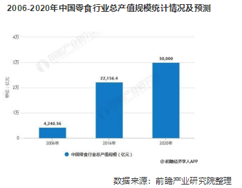 近年来,随着消费旺盛,零食行业总产值规模呈现快速上升趋势。据前瞻产业研究院发布的《中国休闲食品行业消费需求与投资战略规划分析报告》统计数据显示,2006年~2016年,我国零食行业总产值规模从4240.36亿元增长至22156.4亿元,年复合增长率为17.98%。报告预测到2020年零食行业总产值规模将接近3万亿元。