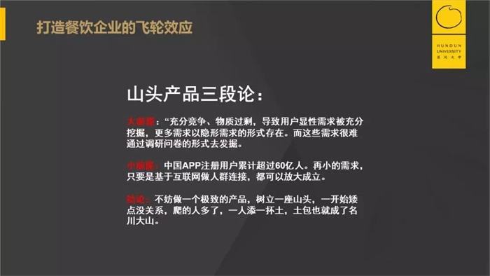 就是说,当下要做一个极致的产品,树立一座山头,一开始矮点没关系,爬的人多了,一人添一抔土,土包也就成了名川大山。