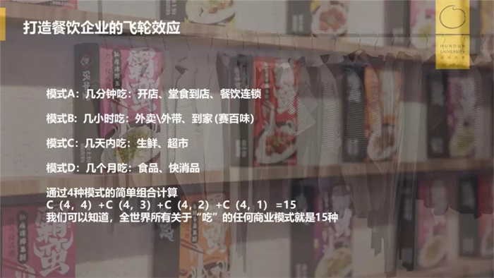 你会发现,全世界所有关于“吃”的任何商业模式就是15种。而关于“吃”的模式创新,就在于选择关键竞争要素,然后ABCD四个模式之间不断的重新排列组合。