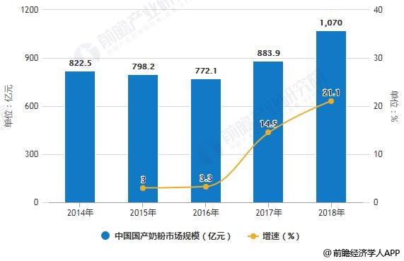 根据数据显示,2018年国产奶粉市场规模约达到1070亿元,增速从2017年的的14.5%上升到2018年的21.1%。与此同时,2016年后国内奶粉整体市场规模趋于稳定,2017、2018年稳定在2200亿元规模上下,主要系国内奶粉市场总消费量趋于稳定,奶粉市场的竞争已经从增量市场转变为存量市场的竞争,同时国产奶粉比例不断扩大。