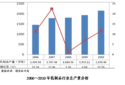 中国乳制品行业起步晚,起点低,但发展迅速。特别是改革开放以来,奶类生产量以每年两位数的增长幅度迅速增加,远远高于1%的同期世界平均水平。中国乳制品产量和总产值在最近的10年内增长了10倍以上,已逐渐吸引了世界的眼光,但同时,中国人均奶消费量与发达国家相比,甚至与世界平均水平相比,差距都还十分悬殊。今年来我国乳制品行业产量稳定增长。2007年达到22.46%的高点,由于2008年三聚氰胺事件的影响2008年、2009年有回落,截至2010年,全国乳制品产量达到2159.4万吨,同比增长11.59%,增速逐步提高。乳制品行业的迅速发展,对人力资源管理提出更高的要求。