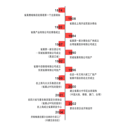 1、企业简介:雀巢公司,由亨利•雀巢(Henri Nestle)于1867年创建,总部设在瑞士日内瓦湖畔的韦威 (Vevey),在全球拥有500多家工厂,为世界上最大的食品制造商。公司起源于瑞士,最初是以生产婴儿食品起家,以生产巧克力棒和速溶咖啡闻名遐迩。自1987年在双城设立第一家合资工厂以来,雀巢对中国的直接投资已达约70亿元人民币,在中国经营着20家工厂,拥有员工约13000名。下图为雀巢在中国的发展轨迹:
