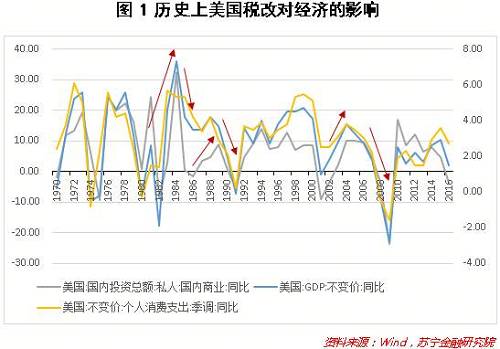 短期对经济有提振作用。减税相较于政府增加开支,不存在挤出效应,是力度较大的扩张性政策。从减税历史来看,上世纪80年代以来有过三次较大规模的减税,均在短期内产生了提振经济的作用。其中,前两次是里根政府在滞涨背景下分别于1981年和1986年实施的税制改革,第三次是小布什政府在互联网泡沫破灭和911事件后的减税政策。