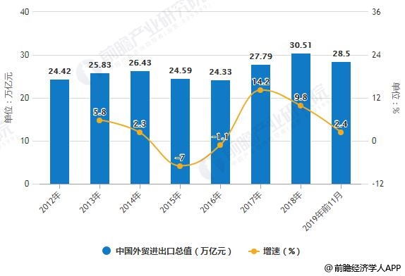 2012-2019年前11月中国外贸进出口总值统计及增长情况