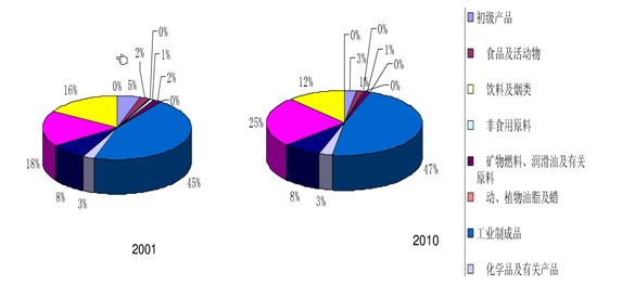 上图为我国2001年和2010年出口商品结构图,从图中不难发现,随着我国经济的发展,工业制成品的出口规模不断扩大从2001年的45%扩大到2010年的47%,而初级产品的规模不断缩小,从2001年的5%缩小到2010年的3%。产品结构趋于优化。