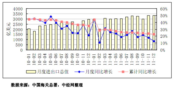 近年来,国内外经济保持增长态势,带动我国进出口规模再创历史新高,2011年全年进出口总值 36420.6 亿美元,同比增长22.5%。但随着欧美债务危机深化蔓延、国际大宗商品高位波动、通胀压力维持高位、国内经济增速放缓、人民币升值压力增加等影响因素影增多,进出口增速呈现逐季回落态势。