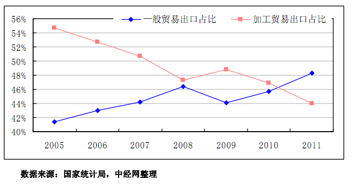 2005年以来我国一般贸易、加工贸易占出口总额比重