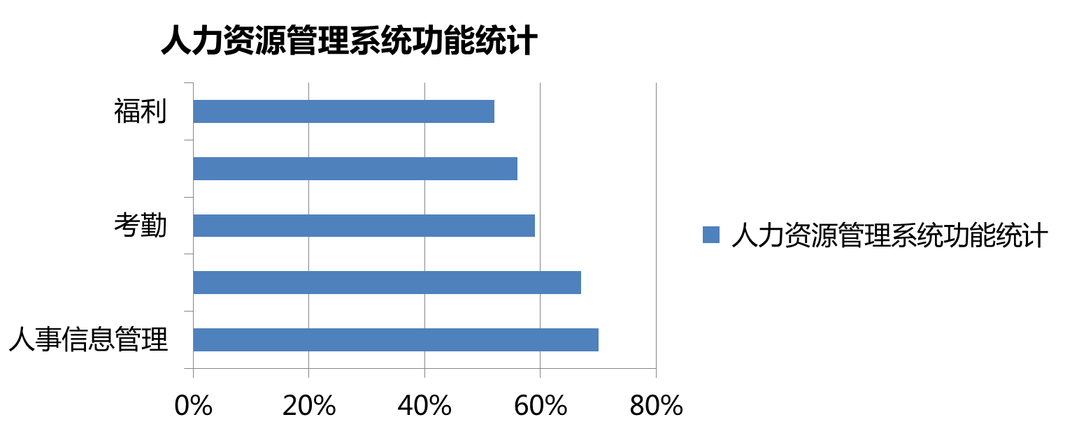 3.企业对人力资源管理信息化的内容主要集中于事务处理 据调查,虽然绝大部分企业对人力资源管理的电子化、网络化、智能化持肯定态度,然而却有超过70%的企业还没有引入人力资源管理信息系统。调查还发现,在已实施过人力资源管理信息系统的企业里,18%的企业需要更换系统。其原因包括系统功能太简单;人力资源管理业务流程需要改善或改变;系统缺乏稳定性和速度慢等。如下图所示:从管理信息系统的功能上看,目前企业使用最多的功能依次是“人事信息管理”(71%)、“薪资”(68.2%)、“报表”(62.2%)、“考勤”(59.5%)、“招聘”(56%)、“福利”(53.8%)等。据此分析,中国企业目前对功能需求最多的是“事务处理层面”的功能,其次是“业务流程层面”的功能。