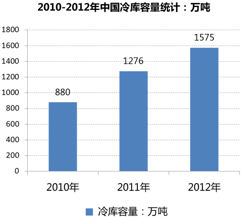冷库业广阔的发展空间,促进产业集中度越来越高:冷链、冷库、制冷设备应用范围广,服务领域不断扩大。无论是工业、农业、建筑业、商业、科学研究、国防建设、文教卫生事业,还是人民生活中的衣食住行都离不开制冷空调设备。国民经济的快速发展的推进,为制冷空调业这一给国民经济各个领域提供配套的制造业提供了广阔的发展空间。如下图所示:2010年冷库容量为880万吨,2011年为1276万吨,2012年为1575万吨,行业增长迅速。