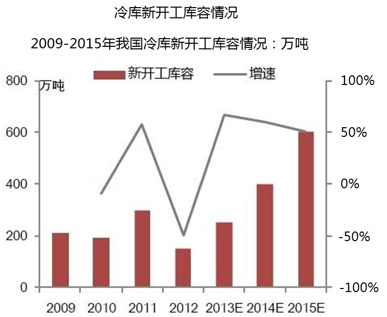 冷链、冷库、制冷设备产业在我国国民经济中的影响力越来越大,在改善民生中的地位越来越突出,社会关注度越来越高,产业集中度越来越高,市场竞争越来越激烈。如下图所示:2009年-2015年冷库新开工阵容平均保持在200万吨左右。