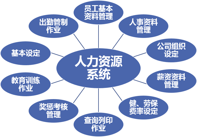 而随着信息技术的不断普及应用,越来越多的企业希望通过信息化的手段提升自身的人力资源管理水平,人力资源管理信息系统由此应运而生。虽然这一系统当前尚处于发展的初期阶段,但其所包含的先进的管理理念和高效的管理手段以及流程己经受到广泛关注。如下图所示:人力资源管理系统设定包括如下几个模块。