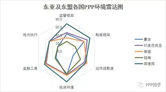 东盟和东亚5国PPP国别环境的发展状况体现了该区域国家在6大评估维度上发展不均。除菲律宾和印度尼西亚PPP国别环境发展相对均衡外,泰国的法律监管框架建设不足;蒙古的PPP地方执行落后,运作成熟度低;而越南的PPP环境不佳,除投资环境外,其余分值都在40分以下,法律监控制度和地方执行得分接近0。(见下图)