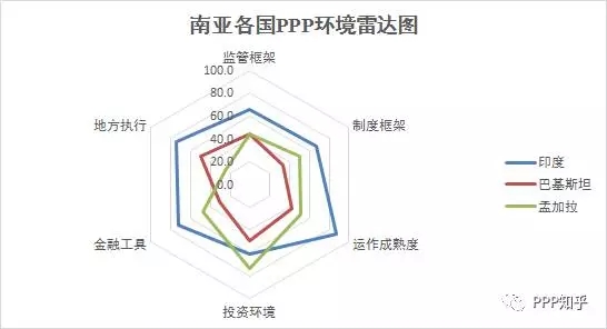 南亚3国(印度、巴基斯坦、孟加拉国)的法律监管框架和制度框架均有待完善,仅印度一国在该两项评估维度上取得了70分,其余两国分值都在40分以下。而投资环境方面,孟加拉国的优势较为明显,得分近80分。同时印度由于PPP项目总量多,实施经验丰富,所以运作成熟度高,接近90分。从单个国家看,印度在6大维度上得分较为平均,各项分值在70-90之间,PPP国别环境较好,市场成熟度高,运作规范,投资印度PPP项目面临的国别环境风险较小;而巴基斯坦PPP环境不佳,所有分值都在40分以下。充分体现了南亚地区国家间PPP发展程度地不平衡。(见下图)