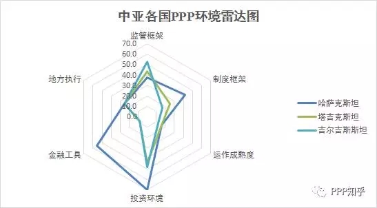 中亚3国(哈萨克斯坦、塔吉克斯坦、吉尔吉斯斯坦)的PPP国别环境呈现出明显的特点,即PPP宏观环境(包括法律监管框架、制度框架、运作成熟度和地方调节)都不尽完备,以上4个维度,3国的得分都低于40分。而投资环境和金融工具方面,哈萨克斯坦分别得分70和60,吉尔吉斯斯坦的投资环境也接近60分。