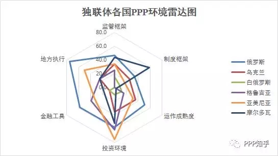 与中亚地区相似,独联体6国(俄罗斯、乌克兰、白俄罗斯、格鲁吉亚、亚美尼亚、摩尔多瓦)中除俄罗斯PPP环境发展相对均衡外(仅法律监管框架一个评估维度低于60分),其余5国普遍存在PPP宏观环境薄弱的问题,在法律制度建设方面明显不足,市场成熟度不高。但是随着区域开放程度不断提升,其投资环境向好趋势明显,多数国家得分接近60分。不过白俄罗斯的PPP整体环境较差,所有评估维度分值均在20分以下。(见下图)