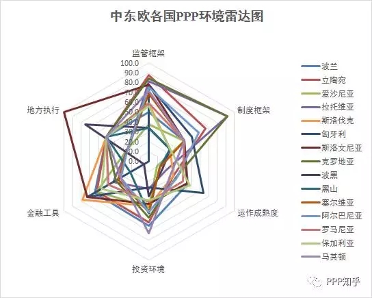 不同于中亚和独联体地区,中东欧15国(波兰、立陶宛、爱沙尼亚、拉脱维亚、斯洛伐克、匈牙利、斯洛文尼亚、克罗地亚、波黑、黑山、塞尔维亚、阿尔巴尼亚、罗马尼亚、保加利亚和马其顿)制度层面的PPP宏观环境普遍较好,其中克罗地亚和拉脱维亚的制度框架得分接近满分100分,而法律监管框架的分值也都超过了80分。但是PPP项目的运作成熟度方面,除匈牙利得分超过60分以外,其余国家的分值均在40分以下。而在地方执行方面,除俄罗斯和波黑外,其余国家分值都在50分以内,可见在中东欧地区PPP制度建设已经超越了实务发展,体现了一定的前瞻性,但是也呈现出发展规模相较PPP制度建设的滞后性。而就投资环境和金融工具来看,中东欧国别环境大致和独联体国家等同,分值普遍位于50分至80分之间。(见下图)
