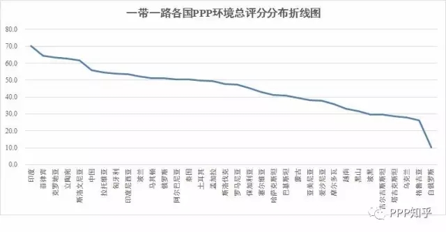 就单个国家而言,由于数据统计的原因(总计35个一带一路沿线国家中东欧国家占了三分之以上),总体评分位居前10的国家中,中东欧国家占据了6席。而印度和菲律宾作为亚洲PPP发展规模较大的国家,得分位居所有35个国家的第一和第二位。后5位国家集中在中亚和独联体地区,总体分值均低于30分,其中白俄罗斯的国别环境最差,得分仅为10分。