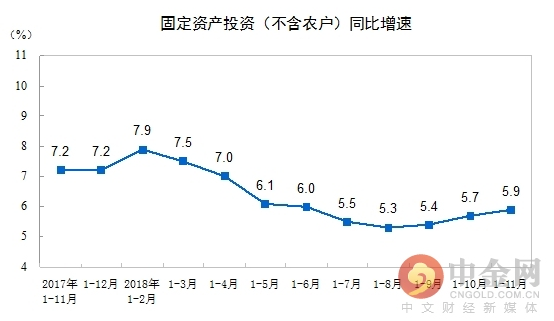 中国1-11月固定资产投资增速至5.9% 升至半年高位