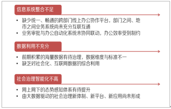 当前我国政务信息化建设存在信息系统整合不足、政务服务效能不高、数据资源开发利用水平低等痛点,信息化建设滞后于业务协同需求。当前我国电子政务信息资源碎片化、业务应用条块化、政务服务分割化等问题依然明显,“纵强横弱”的现象依然存在,中央到地方主要的纵向业务系统(海关、税务、审计等部门)电子政务系统发展较快,但不同政务系统之间横向的信息共享和业务协同的能力还十分有限,对社会化、互联网数据的综合应用也不够。