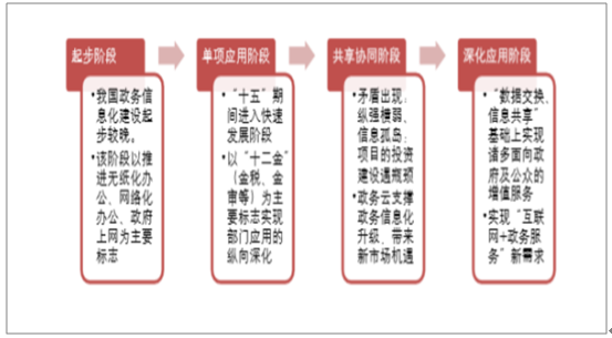 政务云建设及数字化转型推动我国电子政务由“协同共享”向“深化应用”迈进。我国电子政务经过“十五”启动、“十一五”全面建设、“十二五”转型发展,基本实现了部门办公自动化、重点业务信息化、政府网站普及化,处于“共享协同”的发展阶段。当前政务云已在各地广泛落地,政府数字化建设也如火如荼展开,将支撑电子政务向深化应用阶段推进,从而在“数据交换、信息共享”的基础上实现诸多面向政府及公众的增值服务,满足“互联网+政务服务”的新需求。