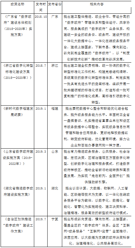 2、数字政府建设加速,互联网+政务服务一体化平台正逐步形成各省数字政府建设进入加速期,旨在突破传统信息化建设的瓶颈。“数字政府”是对传统政务信息化模式的改革,包括对政务信息化管理架构、业务架构、技术架构的重塑,构建大数据驱动的政务新机制、新平台、新渠道,提升政府数字化治理水平。自2018年下半年以来,广东、浙江、福建等多个省份已经出台了“数字政府”相关的政策,推动“互联网+政务服务”建设以及新兴技术与政务的深度融合与应用,加速政府的数字化转型。