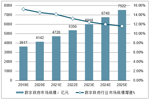 随着中国数字化进程的不断加速,数字政府市场规模将保持持续增长,预计到2025年中国数字政府行业市场规模将达到7522亿元。