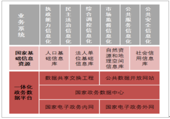 数字政府建设契合“十三五”国家政务信息化工程建设规划。“十三五”政务信息化建设的重点工程主要分为三大领域:1)横向构建“互联网+政务服务”的一体化政务平台,支撑政务业务协同和数据共享;2)中间层:共建共享国家基础信息资源,以打破信息壁垒和“数据孤岛”,逐步实现与业务信息以及社会大数据的关联汇聚,构建统一高效、互联互通、安全可靠的国家信息资源体系;3)纵向建设纵横联动业务系统。《“十三五”国家政务信息化工程建设规划》指出我国政务信息化工程将以推进国家治理体系和治理能力现代化作为政务信息化工作的总目标,大力加强统筹整合和共享共用,统构建一体整合大平台、共享共用大数据、协同联动大系统,推进解决互联互通难、信息共享难、业务协同难的问题。而数字政府建设也需要这样的一体化平台加以支撑。