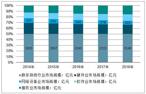 具体来看,2018年,我国正自政府市场中,硬件市场规模最大,为1039亿元,而网络设备、软件和服务分别为424亿元、707亿元和970亿元。