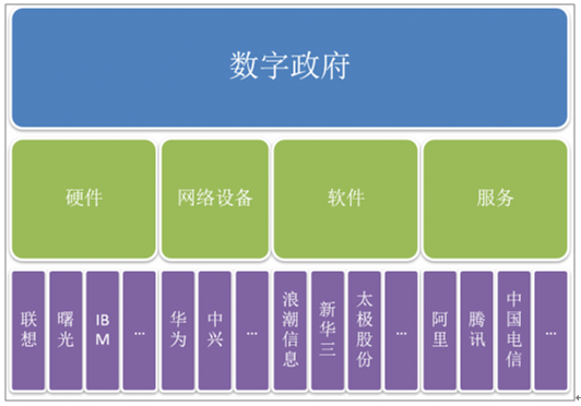 数字政府行业供应商包括硬件、网络设备、软件和服务多个方面,是一个复杂的系统,不同的细分领域供应商不太一样,少部分企业具有较强的集成能力,能在多个领域同时提供产品和服务,比如华为、腾讯,供应组织体系大致如下: