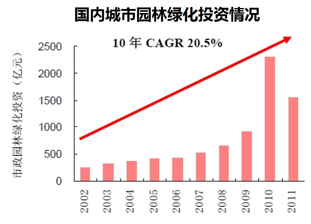 当今现代化的园区建设离不开绿化、美化、生态化,而且随着时代的进步和科学技术的发展,以生态化园林建设为特点的园区建设已经形成一种趋势。如下图所示,自2007年至2011年国内城市园林绿化投资增长率平均在20%。