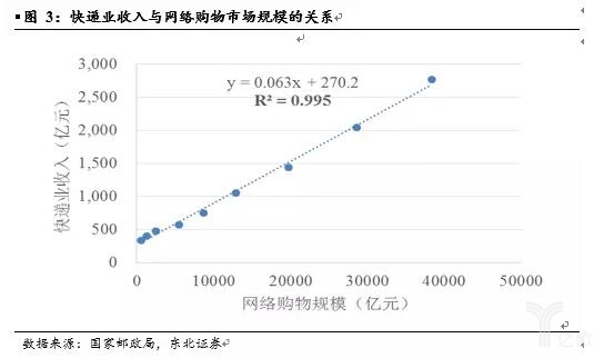 我们在去年的快递行业深度报告中,根据2007-2015年快递业收入规模与网购市场规模数据进行回归分析,我们发现二者存在高度正相关。