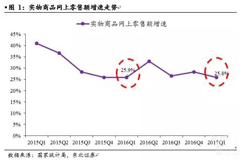 对于网购规模我们采用国家统计局的官方数据(国家统计局从2015年Q1开始公布实物商品网上零售额数据,该数据剔除了不产生物流订单的虚拟商品交易额),我们发现2017Q1实物网购增速为25.8%,而2016年Q1与全年的实物网购增速为25.9%与25.6%,2017Q1实物网购增速并未出现大幅下滑,增速较16年甚至略微提升,因此我们认为“网购增速下滑导致当前快递业务量大幅放缓”的解释并不成立。