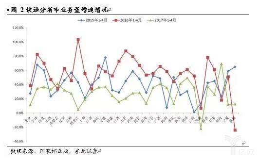 同时,也有专家提到国家邮政局的数据统计由快递企业进行上报,数据可能会存在失真问题(个别省份17年增速较16年大幅回落,如图2)。
