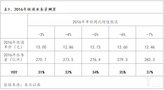 根据我们对2016年快递单价的假设(16年的平均单价同比呈下滑趋势,但高于17年4月12.40的单价),测算得到16年的业务量增速区间在31%-37%,考虑到15年的业务量增速48%,当前单月增速回落到30%以下可以理解。