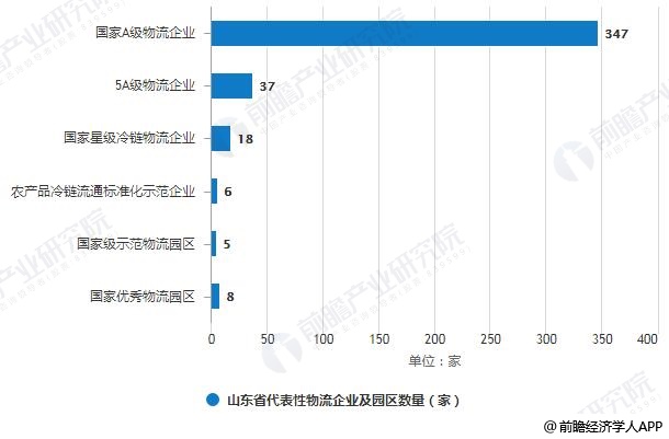 2018年山东省物流业发展水平明显提高,一体化运作、网络化经营、信息技术服务和供应链管理能力明显提升,涌现出一批现代化、规模化、品牌化物流领军企业及示范园区。截至2018年12月,山东省国家A级物流企业347家,5A级物流企业37家;国家星级冷链物流企业18家,占全国的29.5%,数量居全国首位;2018年农产品冷链流通标准化示范企业6家。截至2018年12月,山东省国家级示范物流园区有5家;2018年国家优秀物流园区8家;济南国际内陆港被授予全国首个“国家智慧物流创新先行区”。