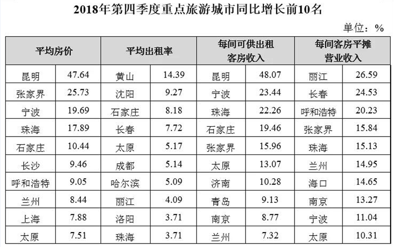 每间可供出租客房收入:增幅位居前10位的城市为昆明、宁波、珠海、石家庄、张家界、太原、济南、青岛、南京和兰州,其中昆明增幅最大,增幅为48.07%;降幅位居前10位的城市为秦皇岛、宜昌、大连、重庆、三亚、福州、温州、南宁、西安和厦门,其中秦皇岛降幅最大,降幅为32.19%。