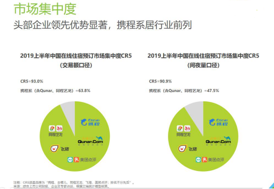 近日,国内老牌数据调研公司,成立17年的艾瑞发布《2019中国在线住宿预订行业研究报告》。报告显示,2019年中国在线住宿预订市场交易额预计超2700亿元,间夜规模预计达9.6亿间夜。在“市场集中度”CR5中(备注:CRn指数,即业内前N家头部企业所占市场份额的总和。艾瑞统计了“携程、去哪儿、同程艺龙、飞猪、美团点评”5大企业集中率,后文简称CR5),携程系交易额口径占63.8%,间夜量口径占47.5%,均超过CR5总量的一半,继续超越美团等行业对手,稳坐第一把交椅。