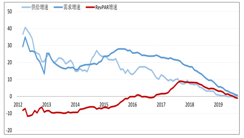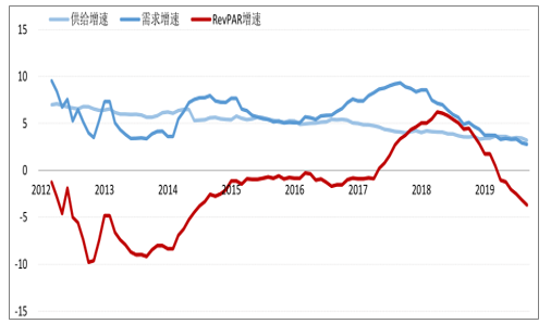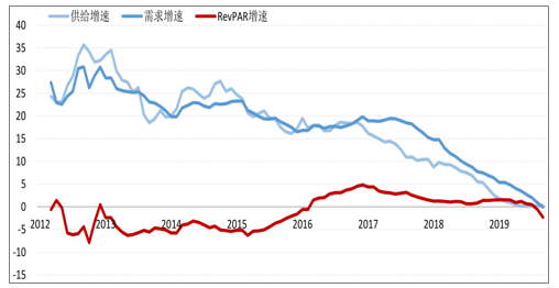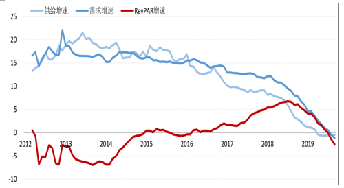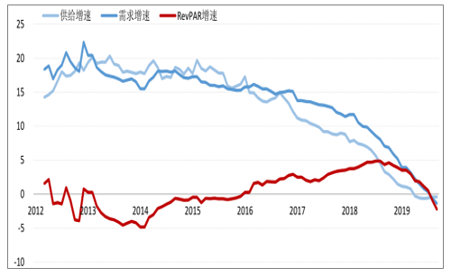 2012年1月-2019年9月中国大陆地区酒店业市场供需和RevPAR同比变化率(%)