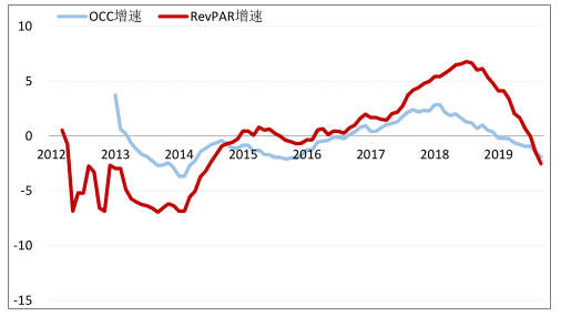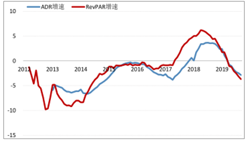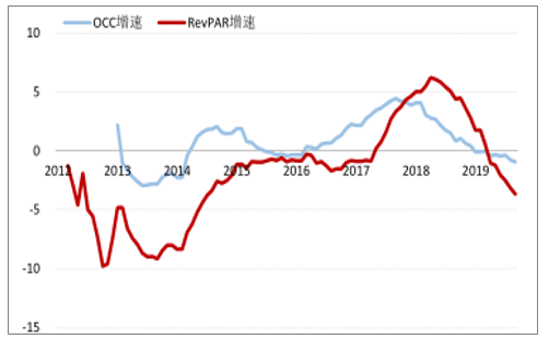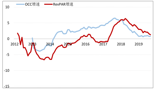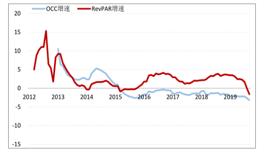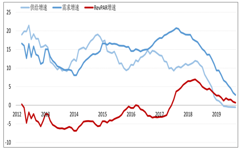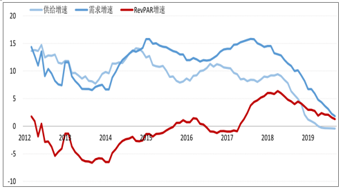 2019年9月我国内地酒店供给增速3.2%,需求增速2.8%,需求增速继续低于供给增速。2016年开始,酒店行业供给端的收缩与需求端的上涨是推动本轮酒店周期上行的主要原因。如今酒店供给端增速相对保持平稳,需求端增速不断下滑,酒店行业已从“供不应求”状态向“供大于求”状态靠拢。未来我国酒店行业供给仍将保持小幅平稳增长,而需求将不断下滑,整个行业需求增速低于供给增速的趋势已经形成,且将持续一段时间,此时已不再是投资酒店行业的最好时机。