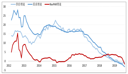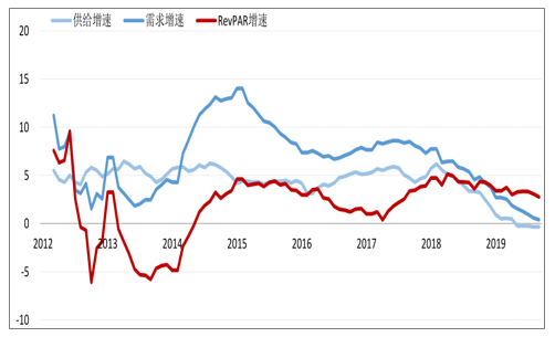 2019年4月以来,我国内地酒店的需求增速持续低于供给增速,据调查数据显示,2019年9月我国内地酒店供给增速3.2%,需求增速2.8%,需求增速继续低于供给增速。2016年开始,酒店行业供给端的收缩与需求端的上涨是推动本轮酒店周期上行的主要原因。