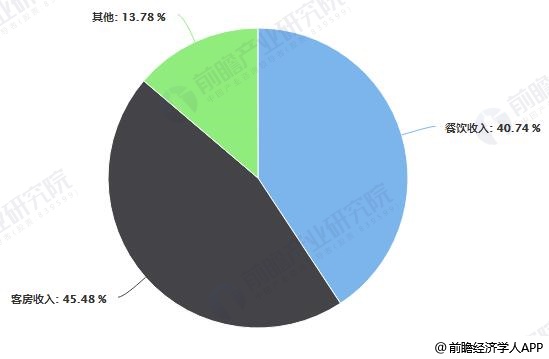 2019年上半年,全国星级饭店营业收入为938.13亿元,其中餐饮收入为382.15亿元,占营业收入的40.74%;客房收入426.69亿元,占营业收入的45.48%;其他收入为129.29亿元,占营业收入的13.78%。