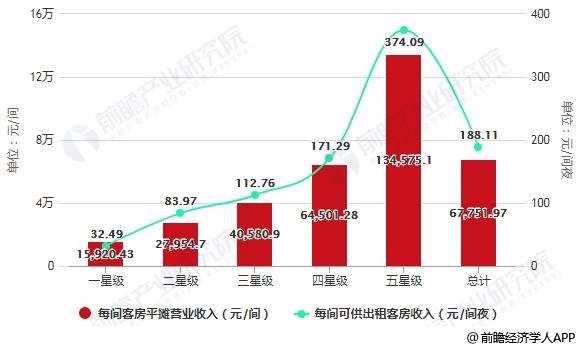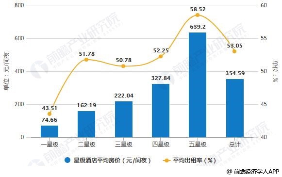 2019年上半年,全国星级饭店平均房价为354.59元/间夜,同比增长2.45%;平均出租率为53.05%,同比下降0.92%;每间可供出租客房收入为188.11元/间夜,同比增长3.10%;每间客房平摊营业收入为33451.46元/间,同比增长0.65%。