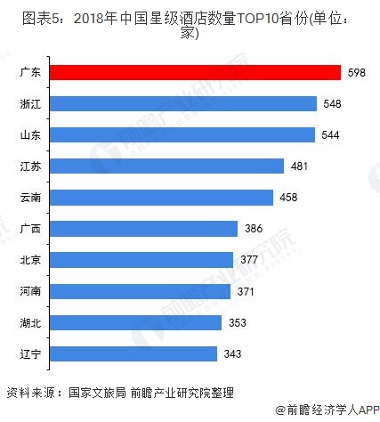从国家认证的星级酒店来看,广东省仍然领跑全国。根据国家文旅局数据显示,截止2018年底,广东省以598家星级酒店排名全国第一,比排名第二的浙江省多50家。其中,五星级酒店95家,四星级酒店132家,三星级酒店331家,二星级酒店39家,一星级酒店1家。