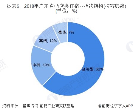 从酒店客房的档次分布来看,广东省酒店主要以经济型为主。2018年,广东省经济型酒店客房数量为121.98万间,占总体的比重为62%;中档酒店客房数量为36.05万间,占比为19%;高档酒店客房数量为23.56万间,占比为12%;豪华酒店客房数量为13.93万间,占比为7%。