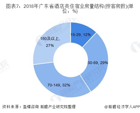 从酒店可放量来看,2018年,广东省15-29间占比12%,30-69间占比29%,70-149间占比32%。150间及以上占比27%。总体来看,占房量41%的酒店类住宿业设施都是70间以下中小型设施,占房量59%的酒店类住宿业设施规模在70间客房以上。