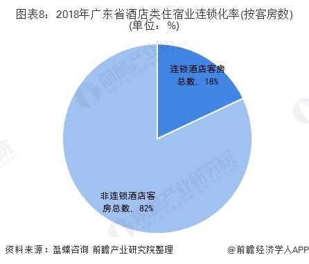 从连锁化率来看,2018年,广东省连锁酒店客房总数为35.05万间,占比为18%;非连锁酒店客房总数为160.47万间,占比82%,广东省酒店的连锁化率仍有较大的提升空间,特别是大量的单店规模50间房左右的小规模连锁酒店,拥有更多的连锁化机会。