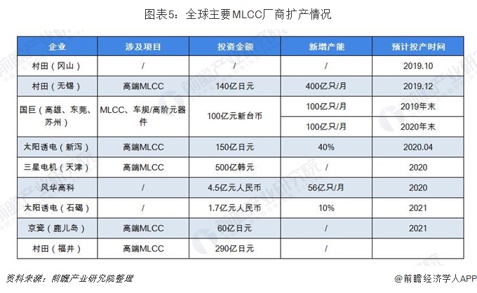 近年来,全球MLCC市场持续处于供不应求状态,价格持续上涨。早年间MLCC的价格持续下降,而市场规模却并未增长,厂商谨慎扩产。随着MLCC市场景气度提升,2018年被动元器件巨头开始新增MLCC产能,新产线的投产时间集中在2019年末至2021年之间。以日韩系厂商为例,村田、太阳诱电、TDK、三星电机在2016、2017年均未对MLCC做扩产计划,受MLCC市场景气度影响,2018年纷纷对外公布扩产计划。除了这四家原厂之外,还有风华高科、国巨、京瓷以及村田均有相应的扩产计划。新产线的投产时间集中在2019年末至2021年之间。其中,日韩系厂商更关注的是智能手机和汽车用高端MLCC(贴片电容)产品。