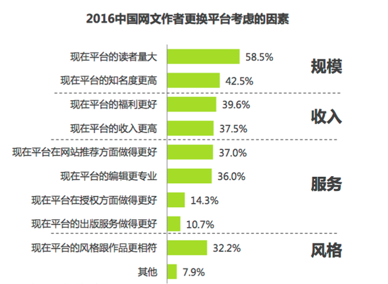 艾瑞资讯在2016年中国网络文学作者洞察报告中指出,影响网文作家选择平台最重要的因素就是平台拥有的读者数量与平台给予稿酬,而阅文集团目前坐拥6亿注册用户,手握90%热门IP,自然成了网文作者的第一选择。