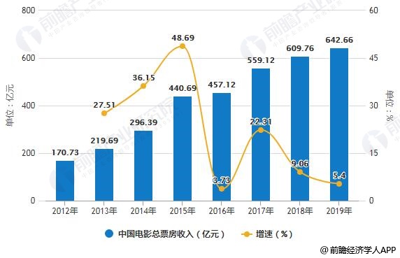 2012-2019年全年中国电影总票房收入统计及增长情况