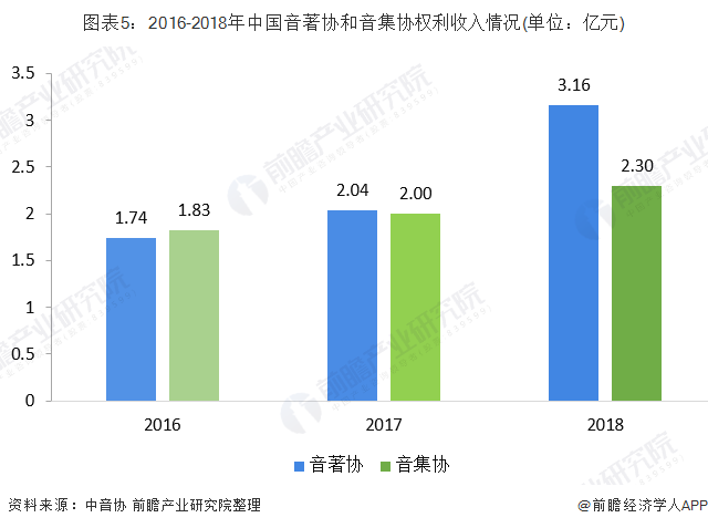 2018年中国音乐著作权协会许可收入达到3.16 亿元,同比增长46.23%;中国音像著作权集体管理协会的总收入达到近2.30亿元,达到历史新高,同比增长15%。